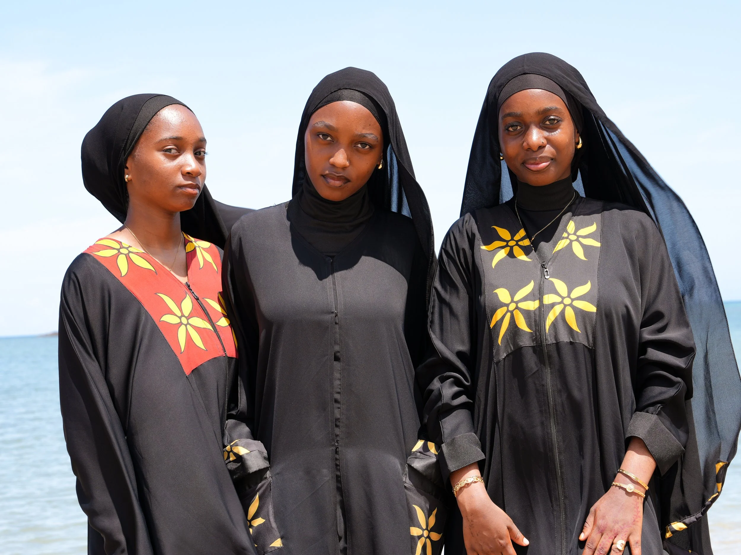 L'élégance affirmée. Cette abaya noire/ rouge, fluide et structurée, est sublimée par deux bandes frontales au motif iconique Zena Mdere Ylang de Mayotte. Pour les femmes qui allient pudeur, identité et modernité.